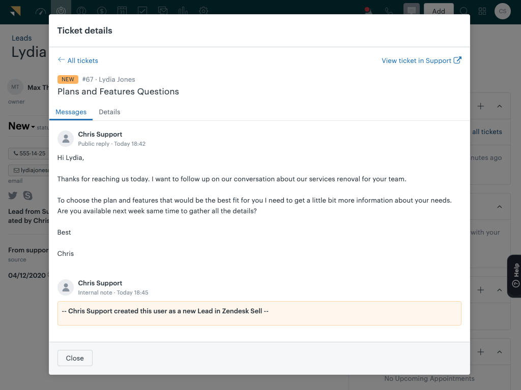 In addition to all communication, notes and tasks, Sell displays Support tickets relating to a lead, contact or deal. With this comprehensive history of record, your sales team can easily understand the past context of a customer.